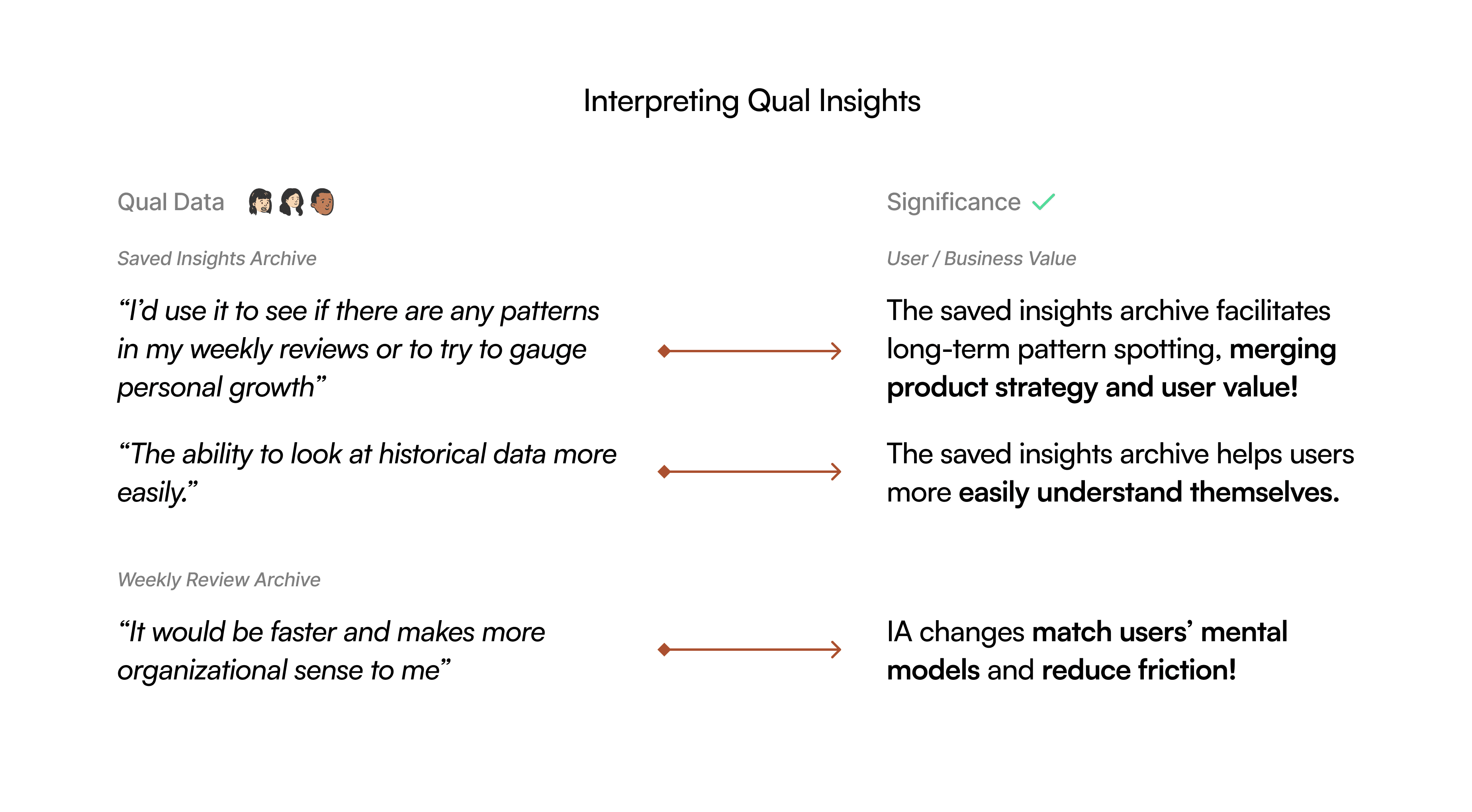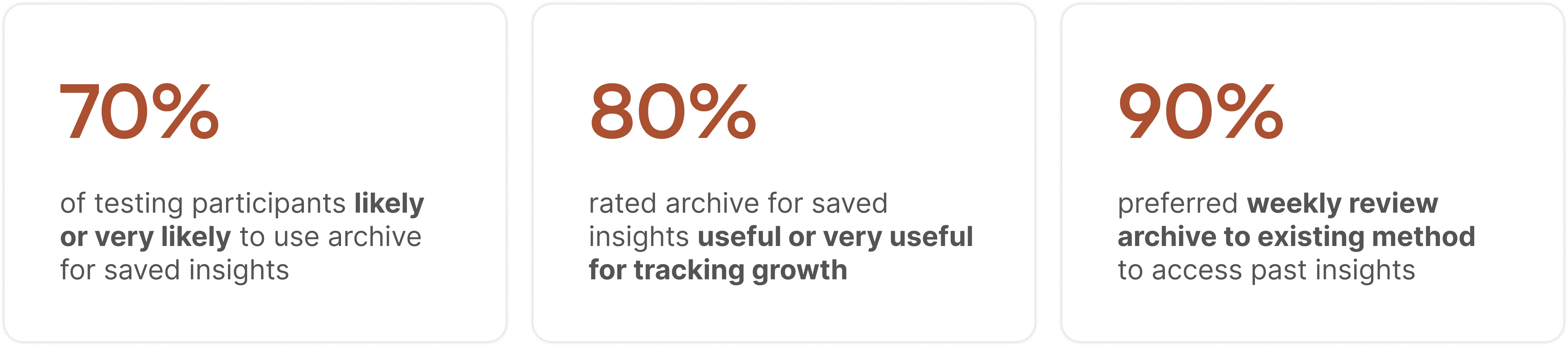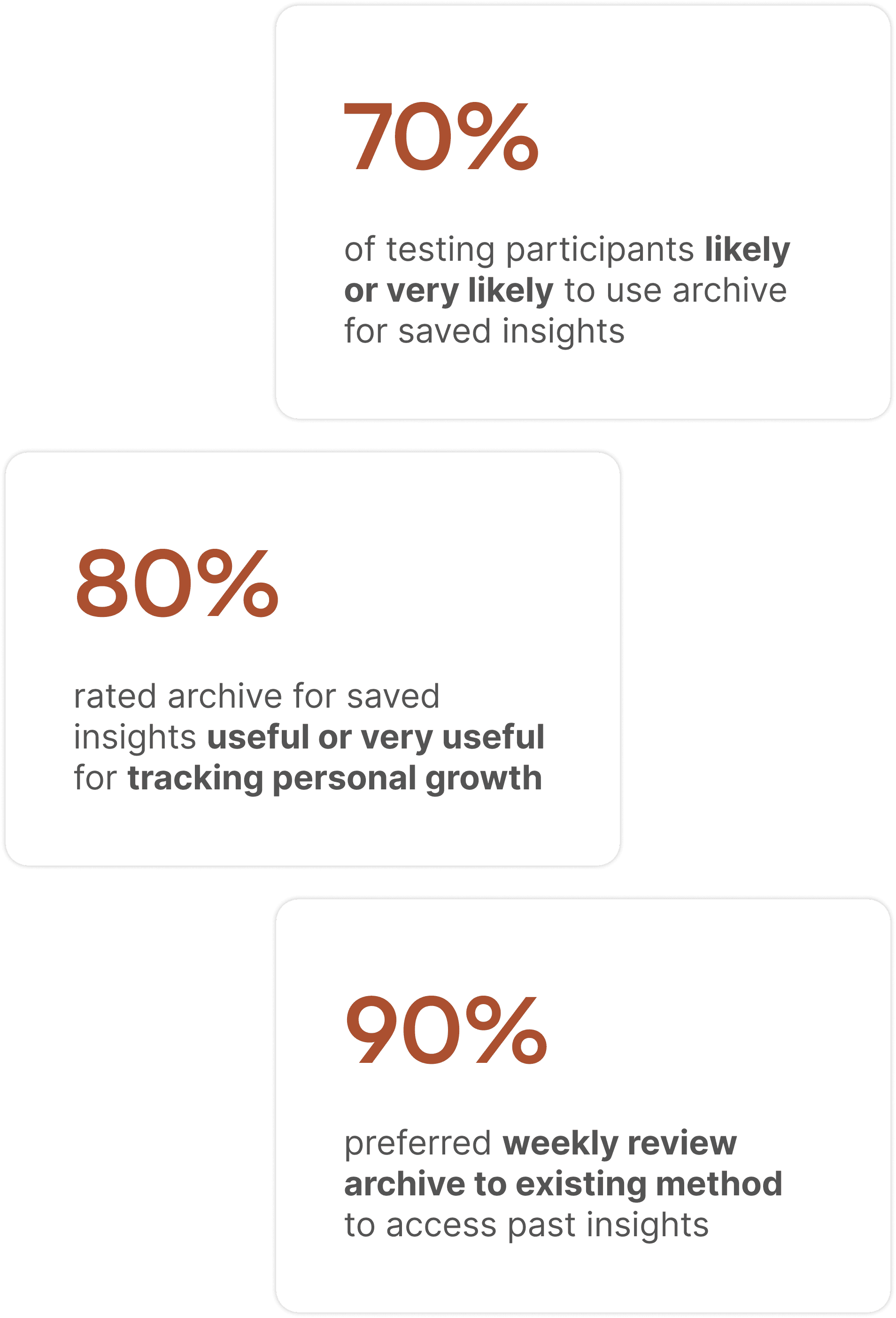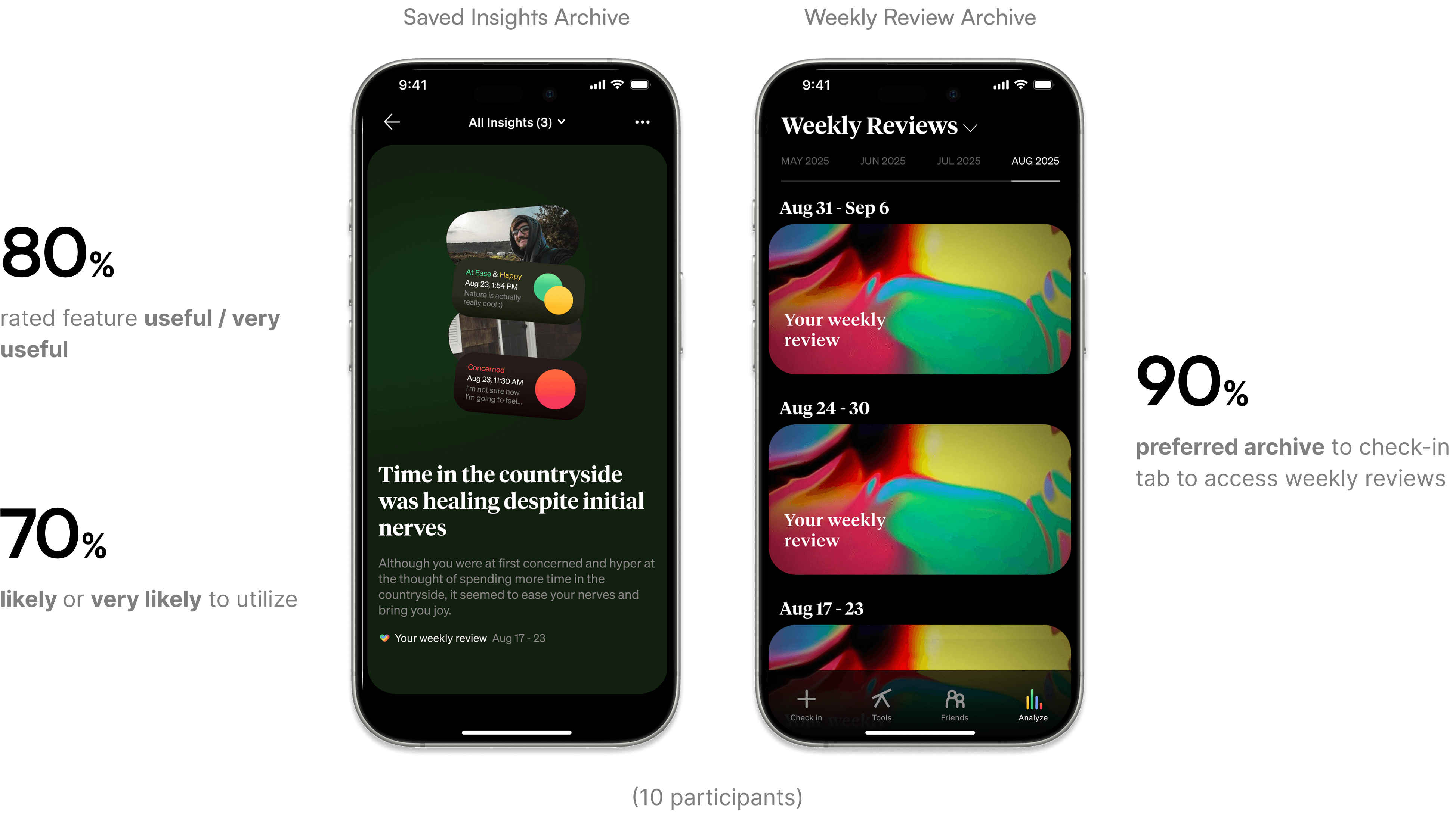 Evaluating the new archives taught me this: the weekly review archive felt fast and intuitive to participants, and they'd utilize saved insights to more easily view historical data and track long-term personal growth.