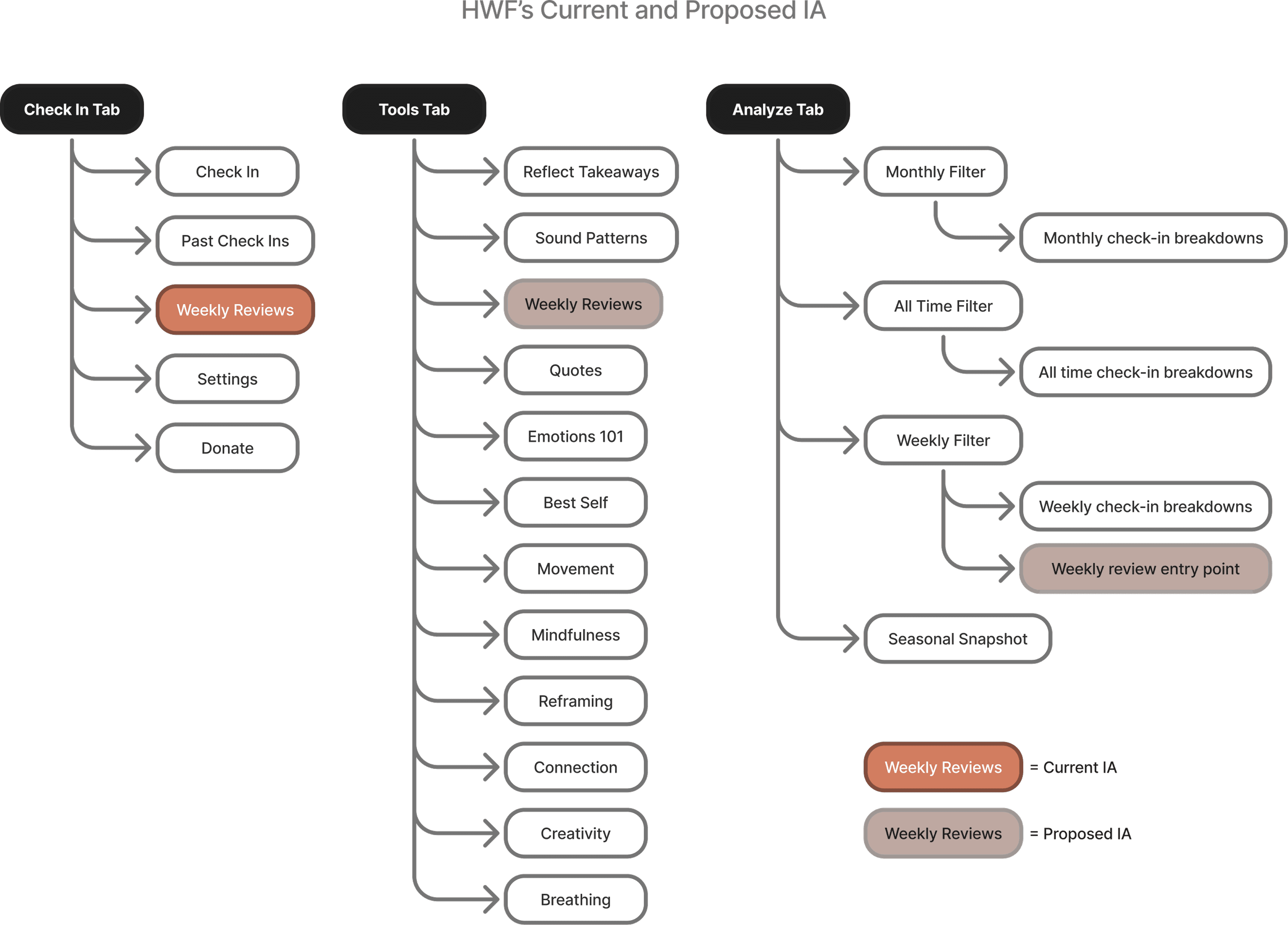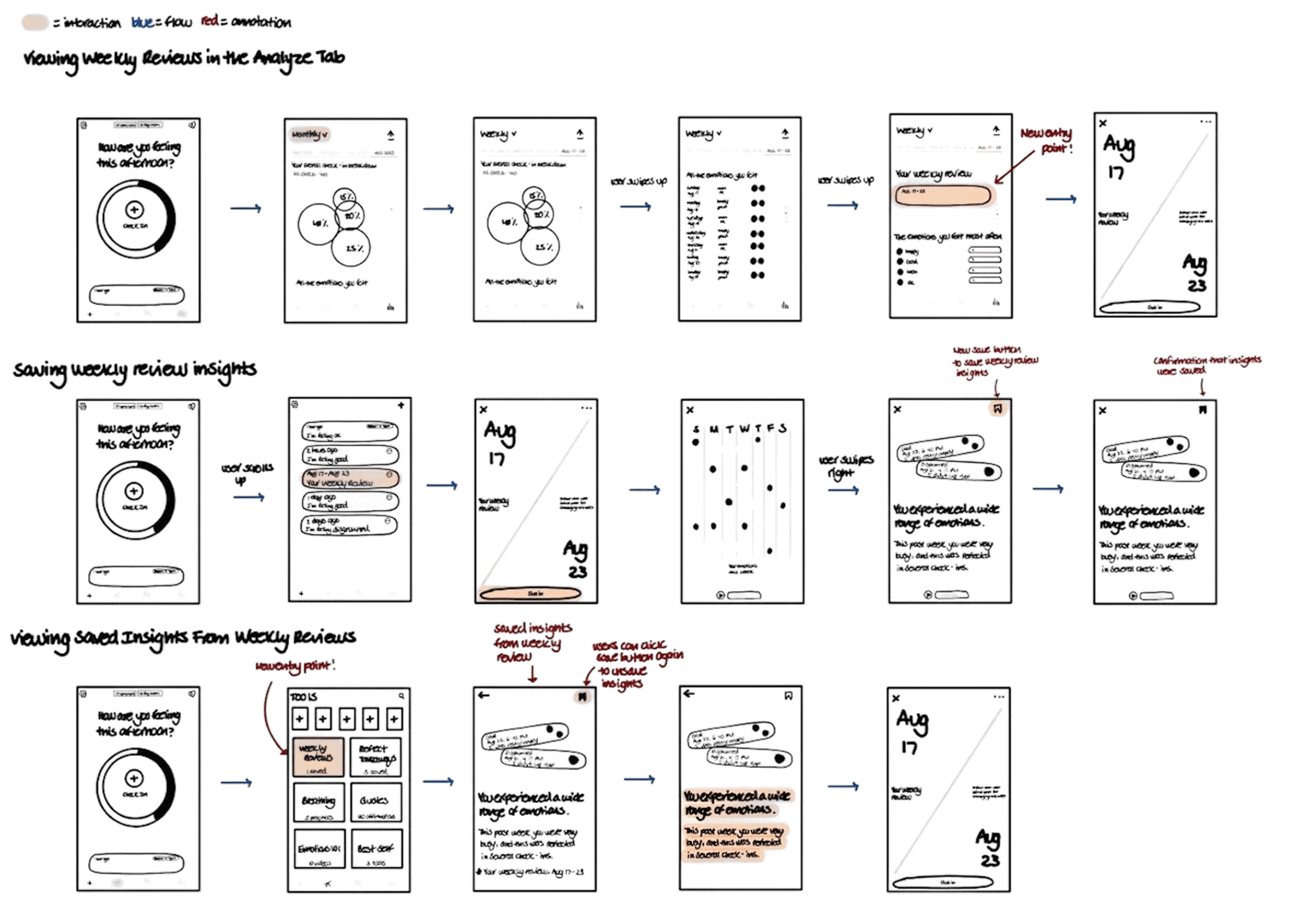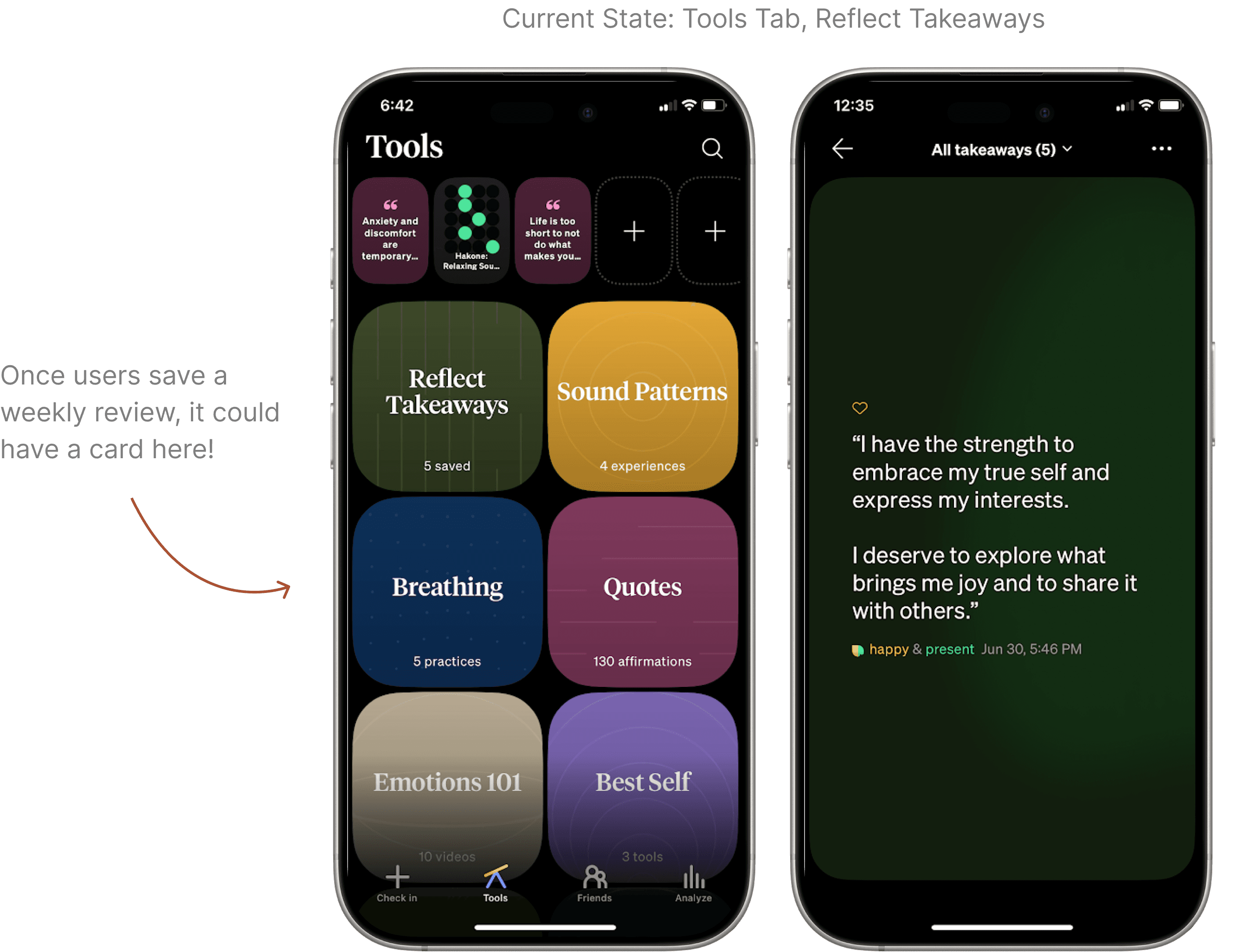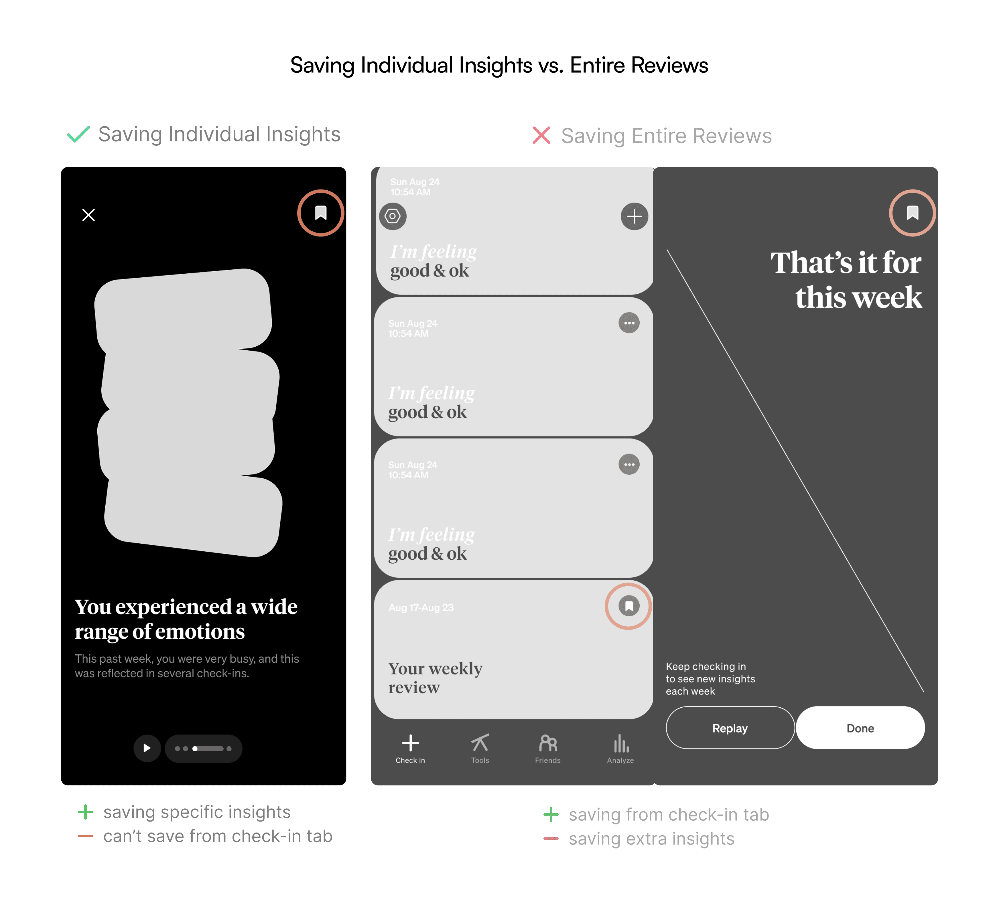 HWF's Tools and Analyze tabs allow users to save in-app resources and analyze their emotions over time, respectively; both stuck out as suitable access points for weekly reviews, so I explored how saving insights and a new entry point fit into them!