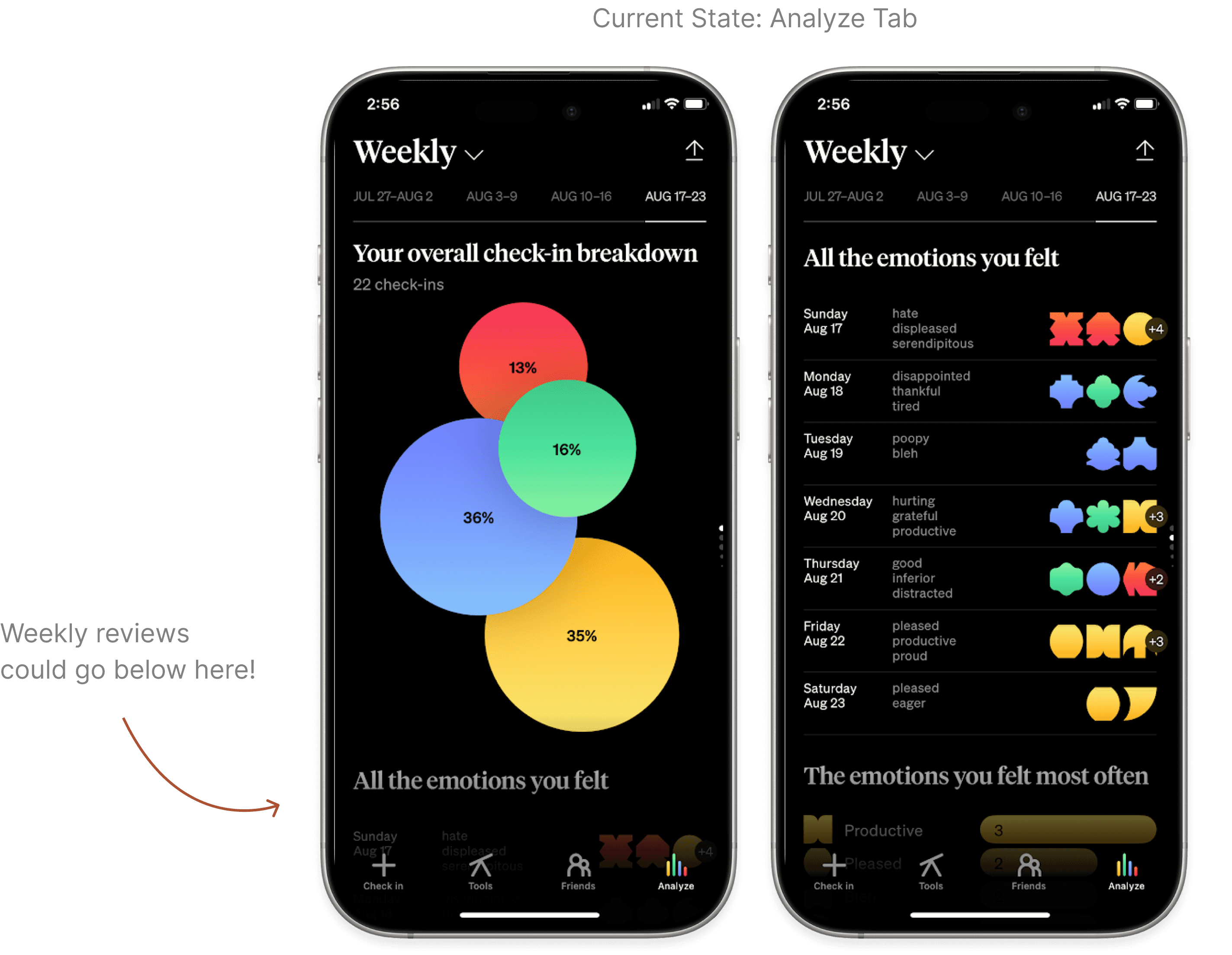 After initially designing a new weekly review entry point, I instead opted for a position-adjusted archive in the Analyze tab to improve discoverability, house weekly reviews, and decrease actions to access them.