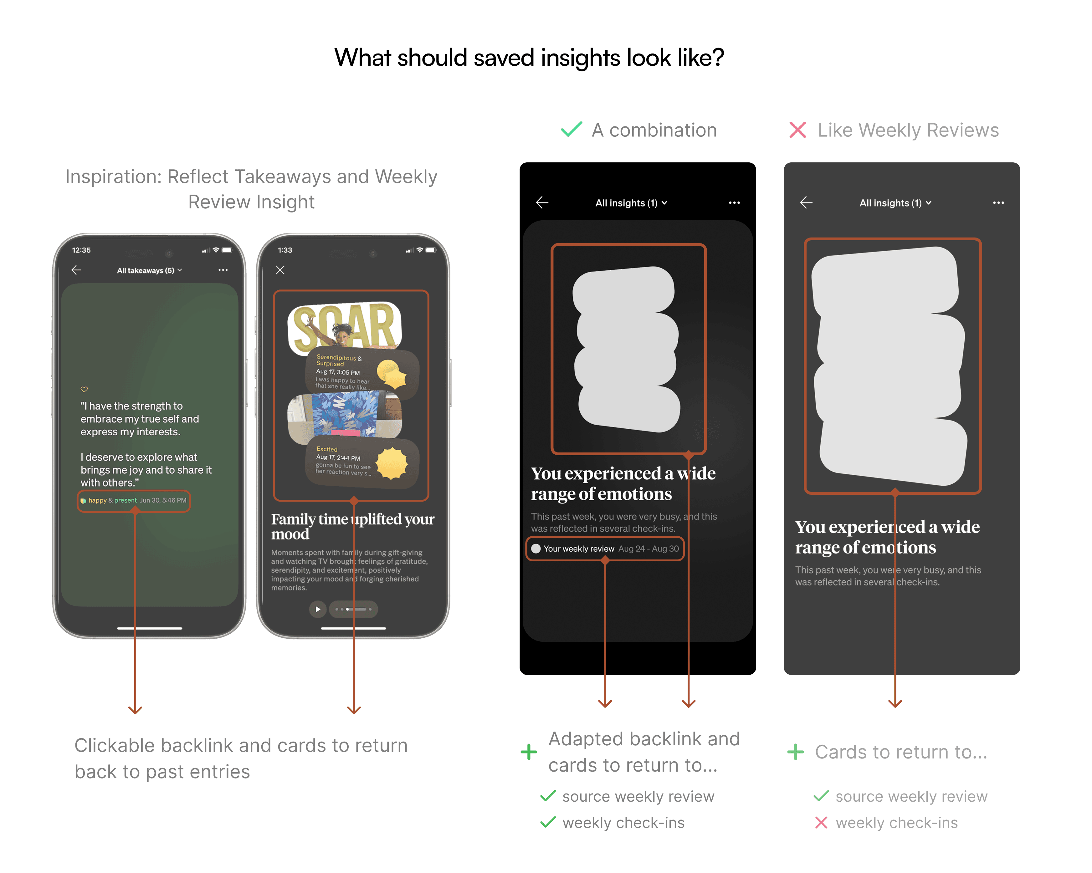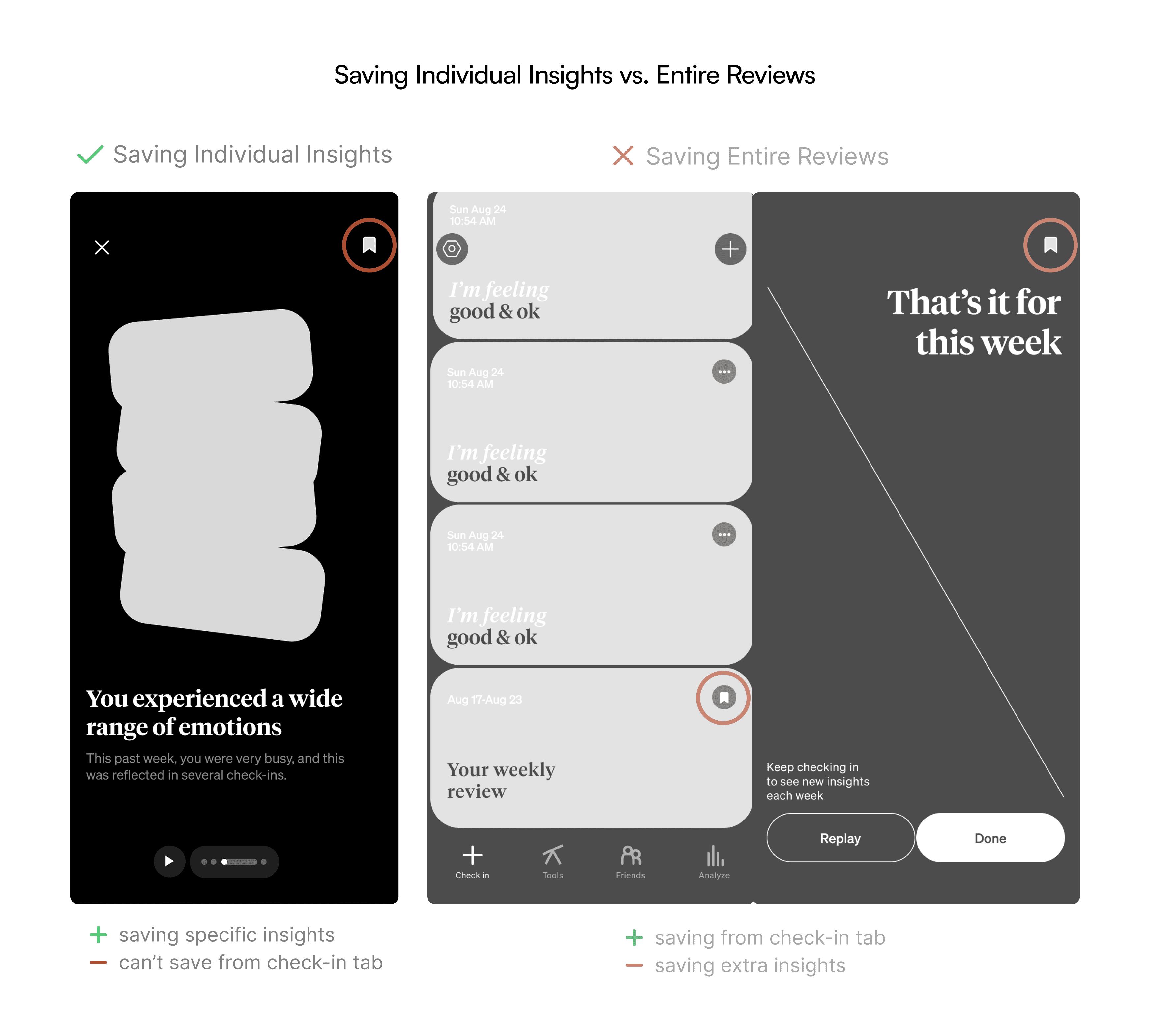 I designed a new insight saving feature alongside a user-built scalable insight archive and automatic weekly review archive to allow users to better understand themselves through more accessible insights and weekly reviews.