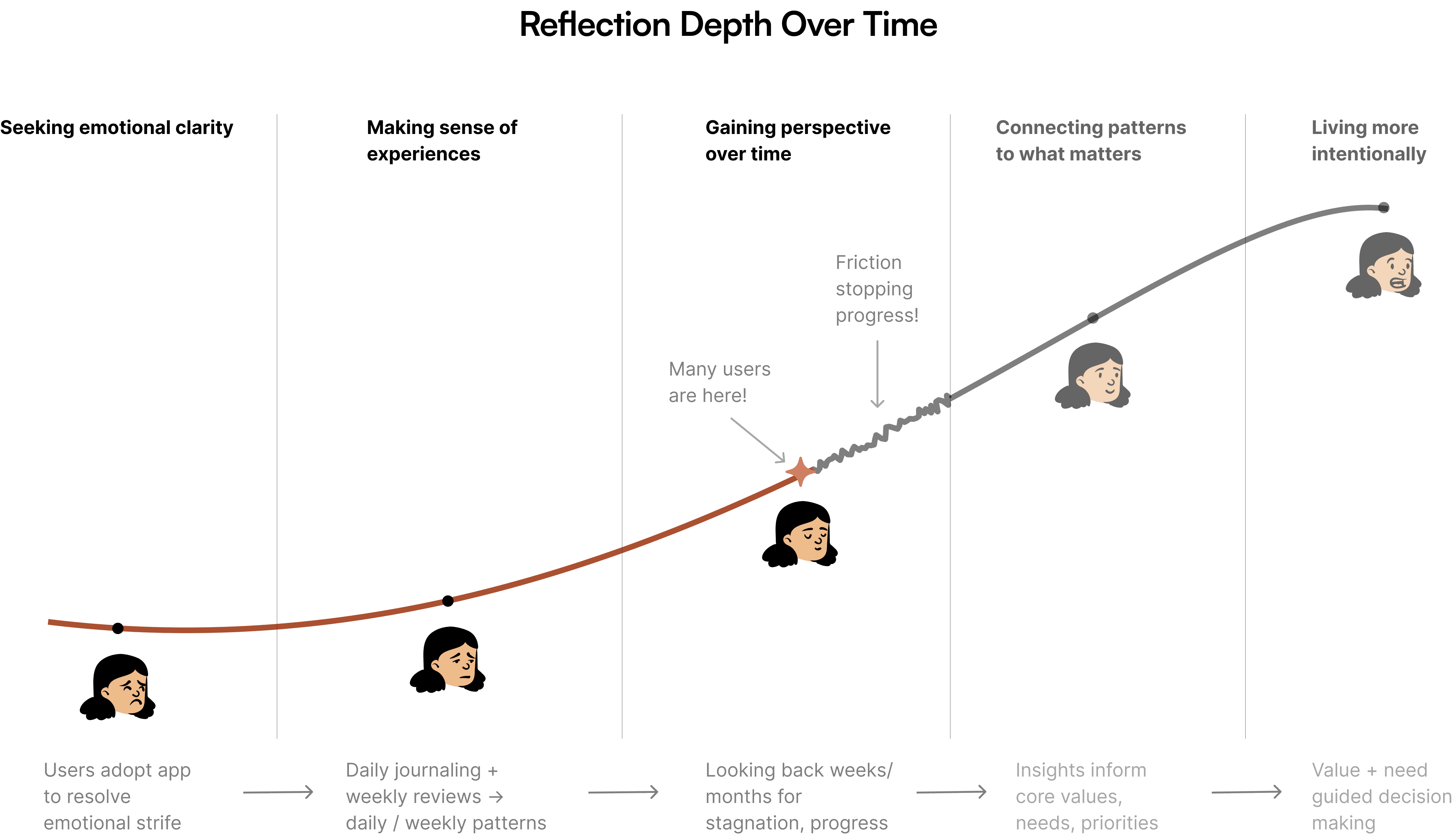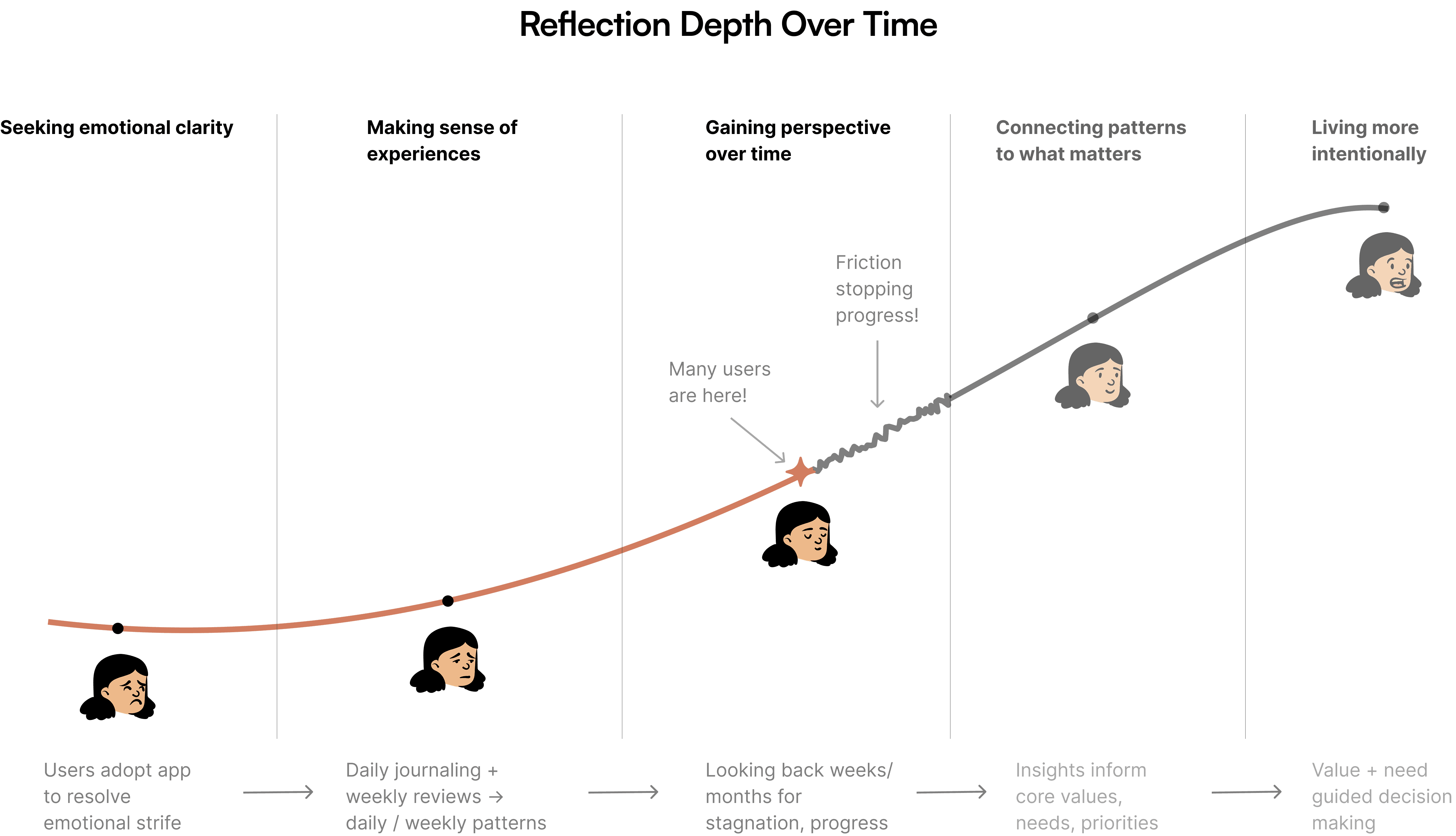 This curve depicts a HWF user’s journey over time and how easier access to long-term insights (e.g. past weekly reviews) reveals patterns and potentially life-defining needs and values.